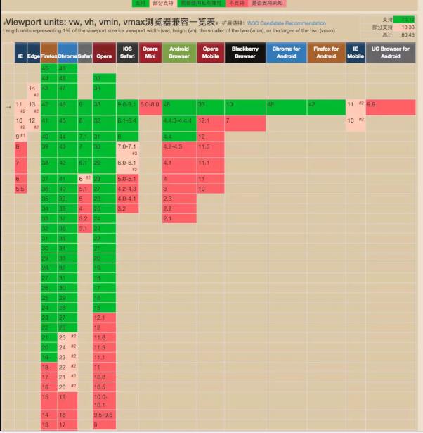 vw這個(gè)vw的方案,相當(dāng)而言還比較新。vw 即(viewport width)可視窗口的寬度。之所以把這個(gè)方案放在后面來說,是因?yàn)関iewport在去年(2017年)的時(shí)候存在不少的兼容性問題,各個(gè)瀏覽器的支持并不是很好。但是來到了2018年這個(gè)時(shí)間點(diǎn),viewport單位意見得到了眾多瀏覽器的支持(80.45%)。