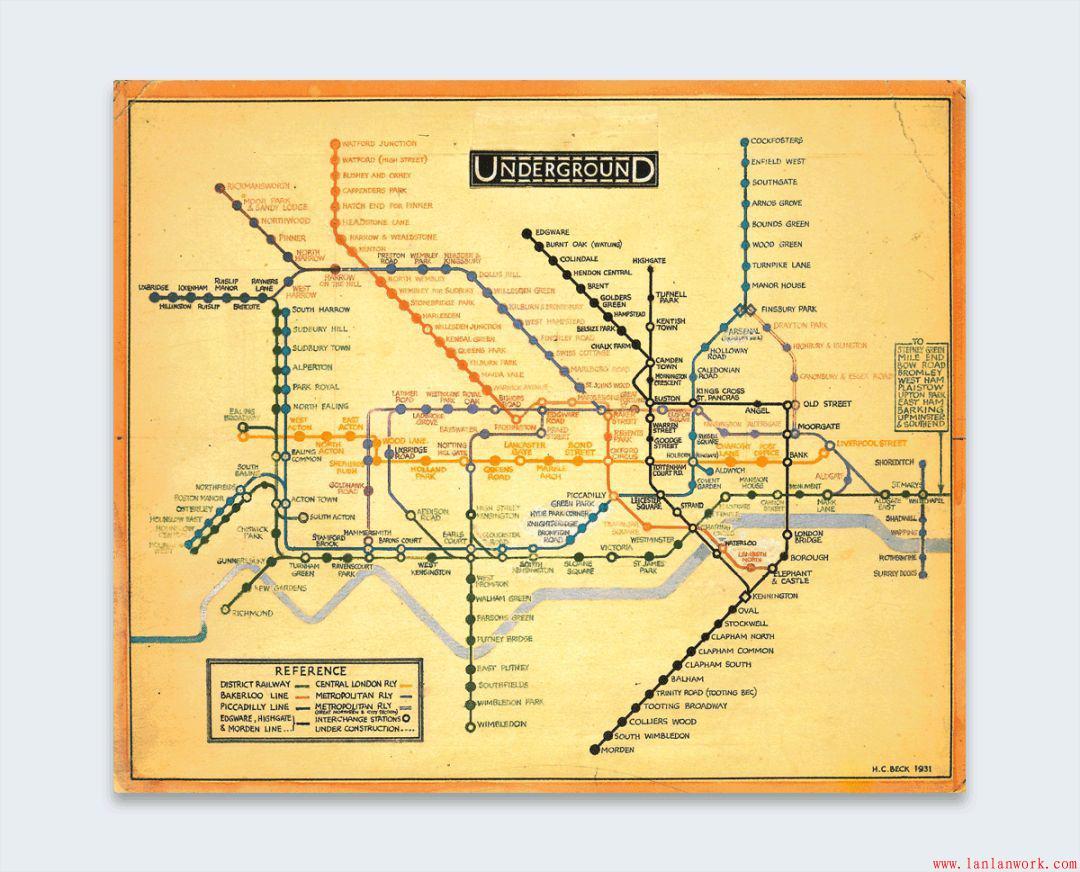說到英格蘭,信息圖表歷史上的一大步是在1933年,當(dāng)時(shí)哈里貝克創(chuàng)建了倫敦地鐵的第一張地圖,只顯示了描繪公共交通路線和車站的線路。這是一個(gè)重要的發(fā)展,因?yàn)樗鼘⒁曈X圖表移動(dòng)到日常生活中。