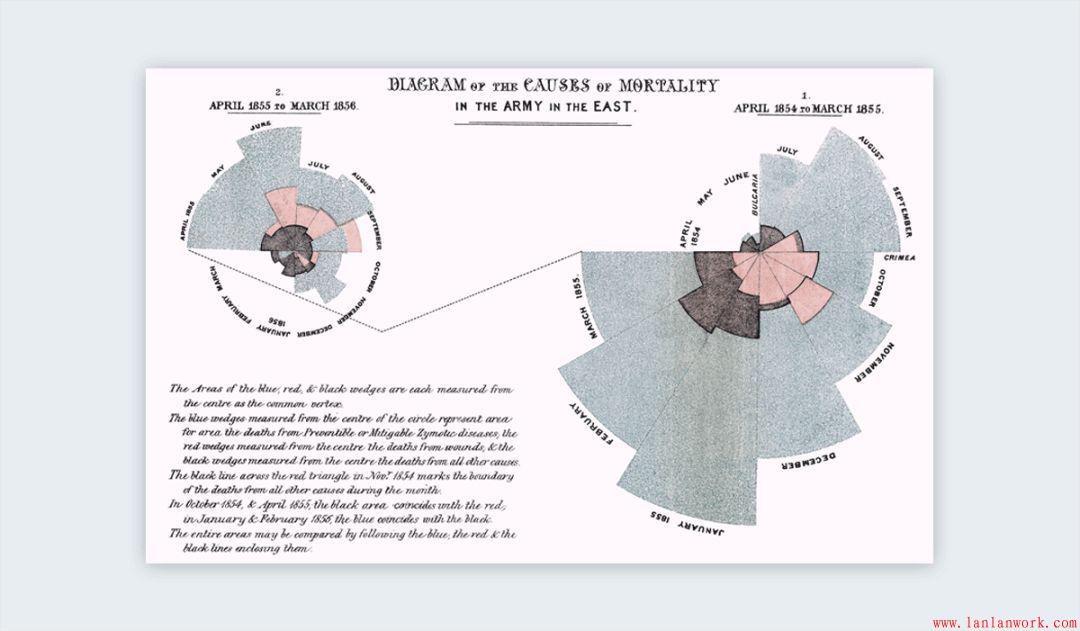 1857年,英國(guó)護(hù)士佛羅倫斯·南丁格爾使用信息圖形,說服維多利亞女王改善軍隊(duì)醫(yī)院的條件。她的圖表顯示了克里米亞戰(zhàn)爭(zhēng)每個(gè)月的死亡人數(shù)和原因:可預(yù)防的藍(lán)色疾病,紅色傷口和其他黑色病因。