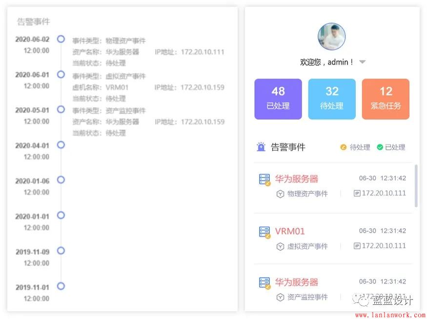 1. 理解用戶所需,優(yōu)化交互,增加部分內(nèi)容。告警事件除了原型中的時(shí)間線按順序發(fā)生外,加了用戶頭像,已處理、待處理、緊急任務(wù)統(tǒng)計(jì)數(shù)字,讓用戶可以總覽全局,做到對(duì)工作量心中有數(shù)。