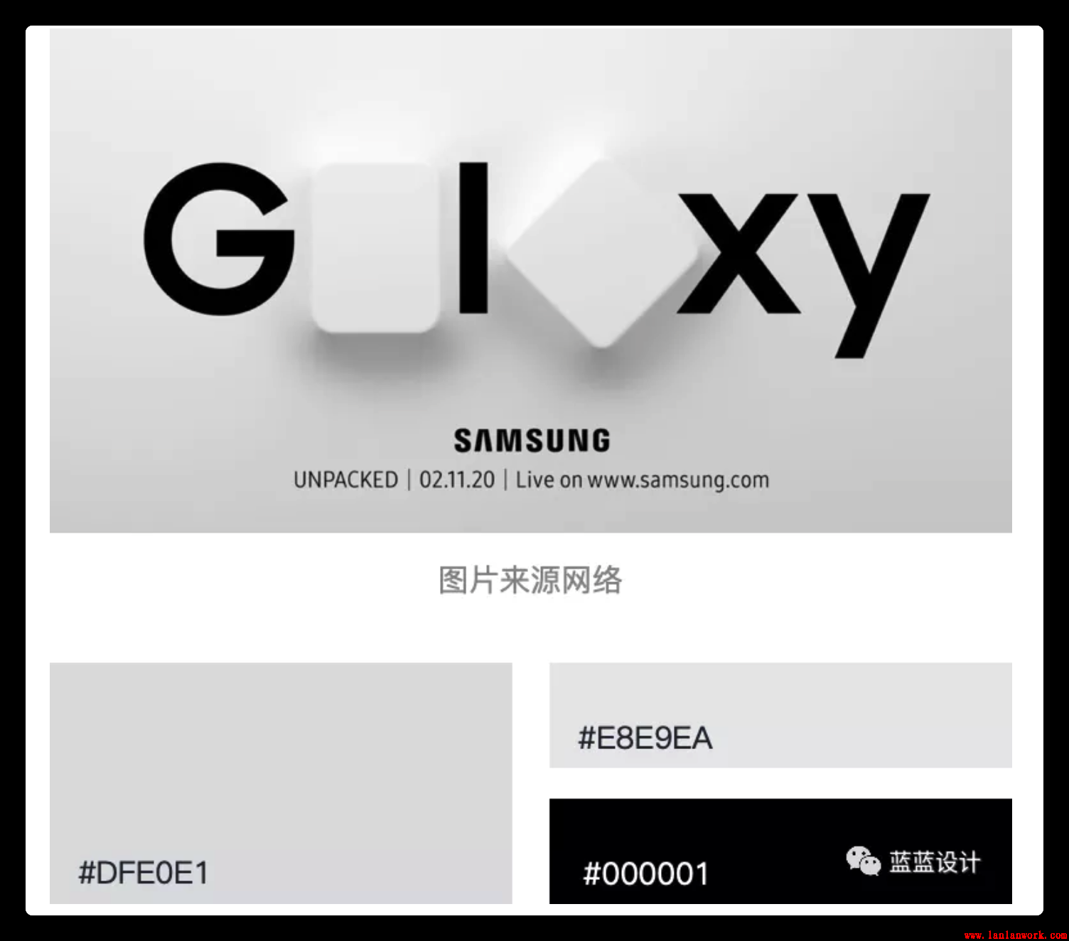 在2020年2月11號(hào)舉行的三星視覺(jué)發(fā)布會(huì)使用新擬態(tài)的設(shè)計(jì)手法作為設(shè)計(jì)海報(bào)。帶有漸變的淺灰色背景,結(jié)合富有層次感的光影漸變,充滿未來(lái)感。相對(duì)克制的色彩選擇和多角度的光影變化,強(qiáng)調(diào)出產(chǎn)品豐富的質(zhì)感和科技感,簡(jiǎn)潔而神秘。