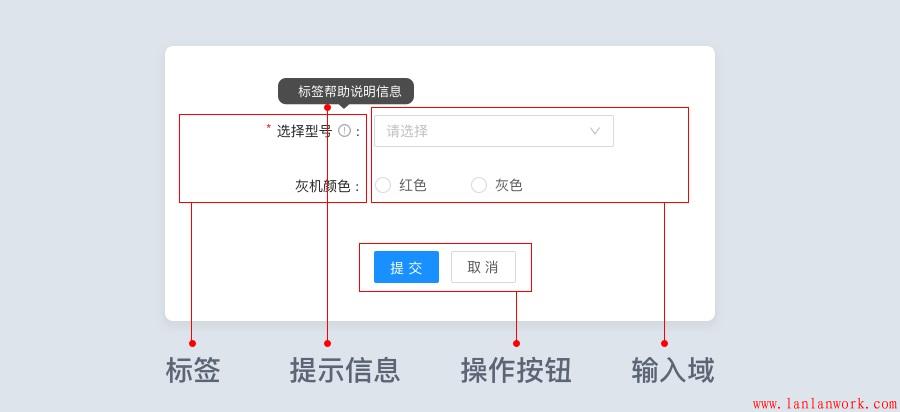 表單主要由這四類元素組成:標(biāo)簽、輸入域、操作按鈕、提示信息。