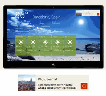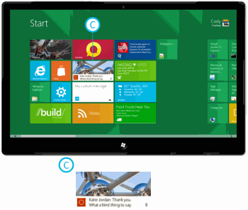 而Windows 8中的瓦片則整合了通知中心與數(shù)字標(biāo)識這兩個(gè)方面的提示功能,用戶即可以直接在瓦片中閱讀提示信息,也可以點(diǎn)擊進(jìn)入應(yīng)用。另外,與iOS通知中心統(tǒng)一化的輸出格式有所不同,Metro風(fēng)格的應(yīng)用瓦片允許設(shè)計(jì)師從大量模板當(dāng)中選擇不同的樣式。