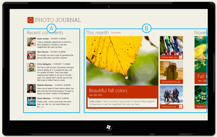 在iPad應(yīng)用中,設(shè)計(jì)師通常需要考慮兩種屏幕定向方式以及對應(yīng)的界面設(shè)計(jì)方案。而Windows 8可以運(yùn)行在多種設(shè)備上,包括平板和臺式機(jī)。因此,我們要考慮到顯示空間更大的情況,讓用戶在大尺寸設(shè)備中能夠看到更多的內(nèi)容。網(wǎng)格布局可以使設(shè)計(jì)方案更好的適應(yīng)于不同的屏幕定向方式及不同類型的顯示設(shè)備,例如針對縱向空間更大的設(shè)備來顯示更多的當(dāng)月特色圖片。