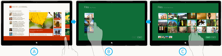 無論在iOS還是Windows中,這兩個(gè)手勢在很多時(shí)候都被用作放大或縮小內(nèi)容對象的尺寸。不過對于Metro應(yīng)用來說,它們還可以通過Semantic Zoom來實(shí)現(xiàn)內(nèi)容層級間的導(dǎo)航。用戶可以捏合某個(gè)內(nèi)容對象,來進(jìn)入它所在的相關(guān)內(nèi)容組。不過,當(dāng)用戶正在以全屏模式瀏覽單張相片的時(shí)候,捏合與張開的手勢還是會被用來調(diào)整圖片的尺寸。