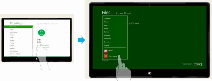 如上圖所示,用戶在PC Settings界面中點(diǎn)擊“瀏覽”,以更換頭像圖片。由于我們的相片日志應(yīng)用支持文件選擇器契約,所以在接下來的文件選擇界面中,就會看到應(yīng)用名稱出現(xiàn)在列表當(dāng)中,用戶可以選擇該應(yīng)用當(dāng)中存儲的相片作為新的頭像。
