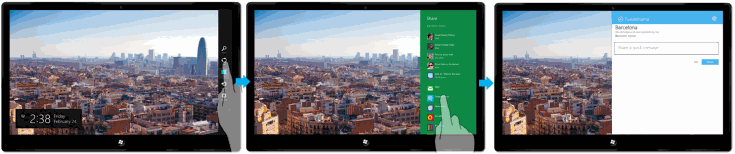 而在Metro風(fēng)格的應(yīng)用當(dāng)中,我們會使用分享契約 。這種技術(shù)方案簡化了設(shè)計(jì)與開發(fā)方面的工作,因?yàn)槲覀儾恍枰獮橛脩粲锌赡苡玫降纳鐣?wù)而將它們與每個(gè)單獨(dú)的應(yīng)用都逐一整合起來。不僅是社會化服務(wù),用戶還可以將信息保存共享至平臺上所有那些使用了分享契約的應(yīng)用,而開發(fā)者們則無需擔(dān)心外部服務(wù)的接口問題。站在用戶的角度,他們可以在charms bar這個(gè)固定的地方完成有關(guān)分享的操作。