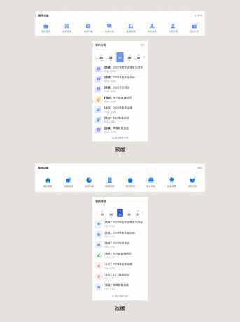 在快速入口和日程模塊中,都有使用裝飾圖標(biāo),顯然大家也能理解他們對于目前的語境來講還是細(xì)節(jié)過多了,所以需要做一些調(diào)整,讓它們簡化。