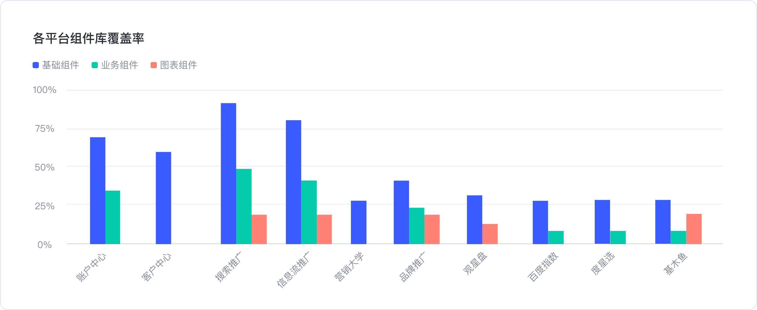 3.各平臺(tái)組件庫引用覆蓋-我們提供了基礎(chǔ)、業(yè)務(wù)、圖表3個(gè)大組件庫,從這個(gè)數(shù)據(jù)可以獲知各個(gè)業(yè)務(wù)平臺(tái)都引用了前述的哪些組件庫,以及各引用了多少組件。