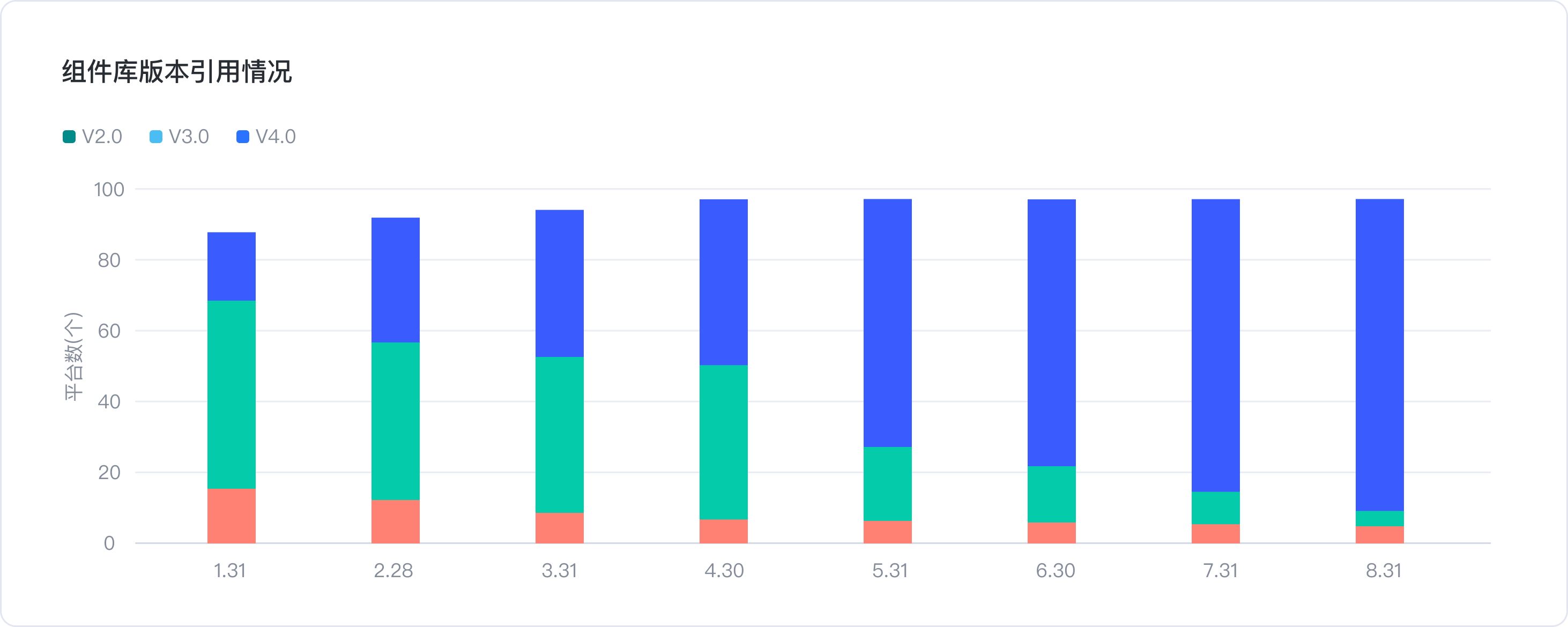 2.組件庫版本引用占比-各平臺(tái)引用的是哪個(gè)版本的組件庫(組件庫每升級(jí)一次,即為一個(gè)新版本)。