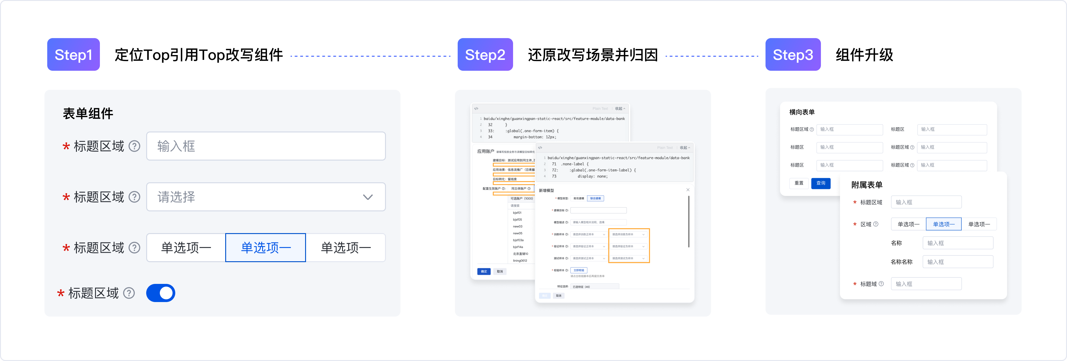 3.針對(duì)不同原因?qū)С鼋鉀Q手段進(jìn)行組件升級(jí):最后,根據(jù)上述問題,逐一進(jìn)行設(shè)計(jì)和研發(fā)升級(jí)。升級(jí)后的表單組件再被業(yè)務(wù)方引用時(shí),免去了改寫的成本,平均單次引用可節(jié)省約1h的研發(fā)耗時(shí)。