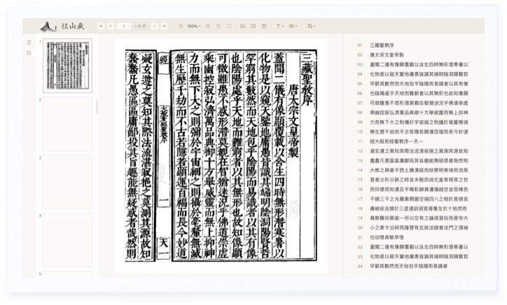 閱讀和操作區(qū)域分開,所有按鈕置頂集中排布,操作區(qū)盡量簡(jiǎn)化,閱讀時(shí)減少干擾。左側(cè)有目錄和縮略圖切換。