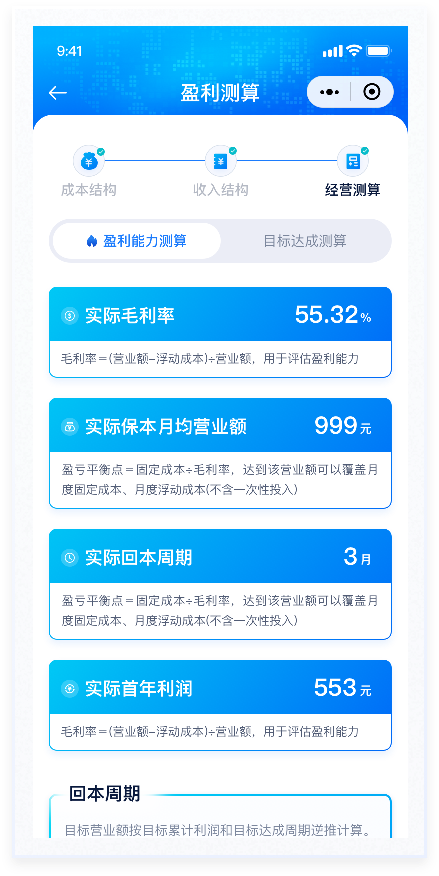 所盈利測(cè)算功能是產(chǎn)品的主要功能,通過(guò)AI對(duì)未來(lái)開(kāi)店盈虧情況進(jìn)行預(yù)測(cè)評(píng)估。本次設(shè)計(jì)主要優(yōu)化該流程的交互及視覺(jué)表現(xiàn),整個(gè)流程分為“成本結(jié)構(gòu)”“收入結(jié)構(gòu)”“經(jīng)營(yíng)測(cè)算”三個(gè)階段,過(guò)程填寫(xiě)情況放置在頁(yè)面頂部,一步了然。已填寫(xiě)使用主題色標(biāo)注,未填寫(xiě)則使用置灰顏色處理,符合用戶(hù)基本感知。按鈕使用與主色相近的漸變色。