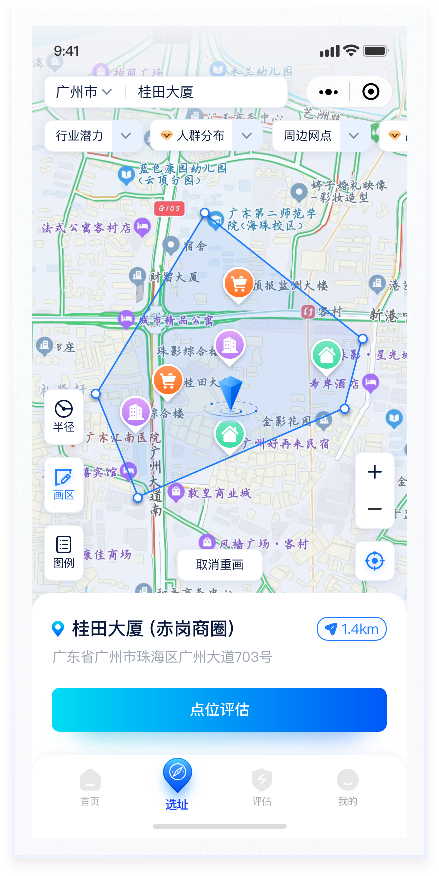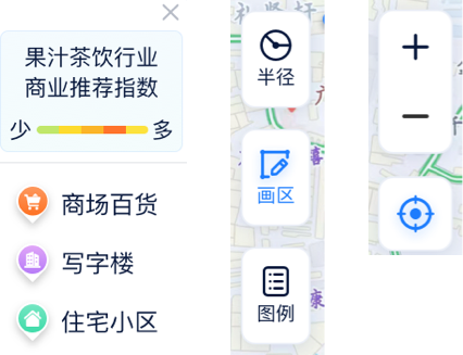 按鈕換膚在地圖上,“半徑”“選區(qū)”便于用戶(hù)對(duì)開(kāi)店范圍的選擇,“圖例”則更側(cè)重圖標(biāo)說(shuō)明性?!胺糯蟆薄翱s小”“定位”則是對(duì)顯示內(nèi)容的操作。