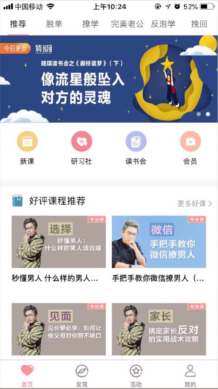 1.首頁根據(jù)產(chǎn)品的不同特色,設(shè)置了二級導(dǎo)航,將、脫單、撩學、完美老公、 反泡學、挽回等分類作為二級導(dǎo)航標題,既能用來統(tǒng)一呈現(xiàn)特色內(nèi)容,又能保證頁 面信息的層級關(guān)系清晰明了;